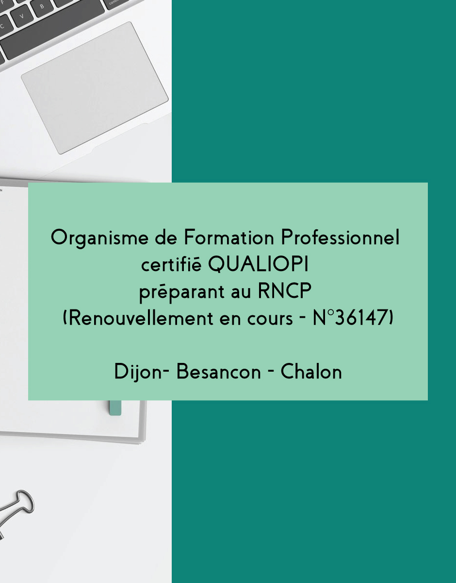 Nos formations préparent à la certification RNCP (N°36147) (les dates de formation, ultérieures au 26 janvier 2025, sont en attente de renouvellement du RNCP)